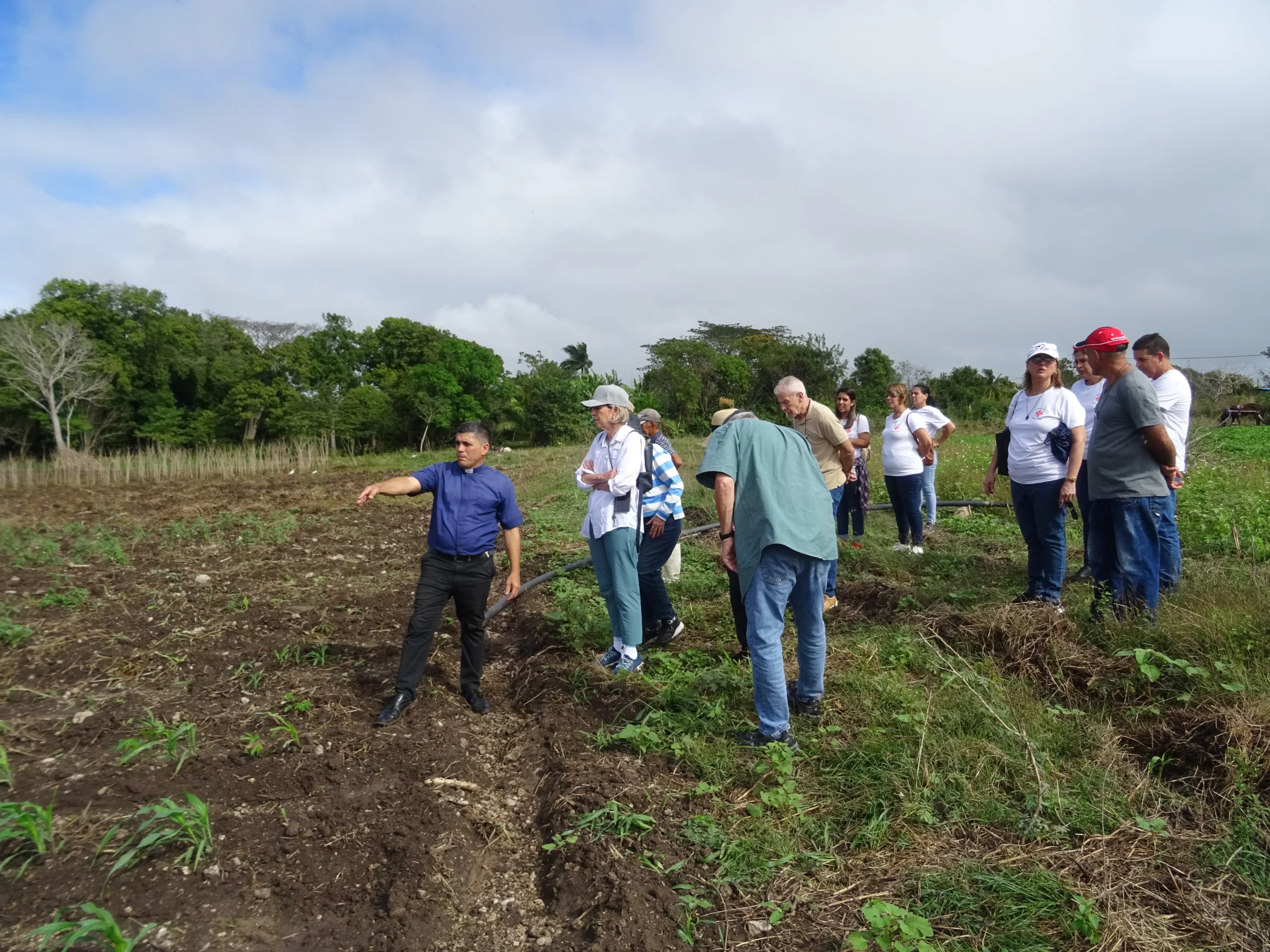 La finca San Antonio de Padua, uno de los tres proyectos agrícolas que impulsa Cáritas Cienfuegos, resultó el primero de los parajes. Bajo la guía del Padre Marcelo Díaz Armenteros, apreciaron los cultivos allí existentes (yuca, frijoles, tomate, boniato, guayaba, ají y otros), los cuales se destinan a los comedores del Programa de Personas de Mayores (PPM).