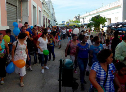 Luego, acompañados siempre por la música, iniciaron su periplo por el bulevar de Santa Isabel a la par que repartieron volantes y mensajes de amor. Todos se hacían fotos. La caminata también fue una verdadera fiesta. Ya en el parque Martí colocaron una ofrenda floral ante la estatua del Apóstol como modesto homenaje y Dany Soler recitó unos versos sencillos.