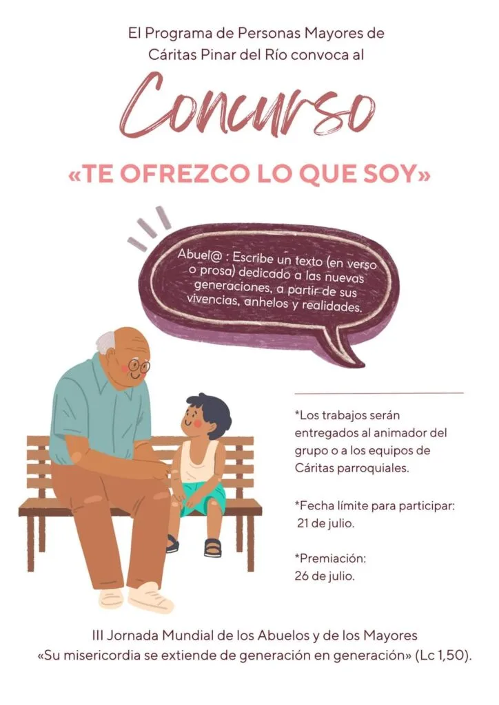 Para animar esta jornada, Cáritas Pinar del Río invita a las personas mayores de su programa a este concurso diocesano, el cual consiste en escribir un texto (en verso o prosa) dedicado a las nuevas generaciones, a partir de sus vivencias, anhelos y realidades.