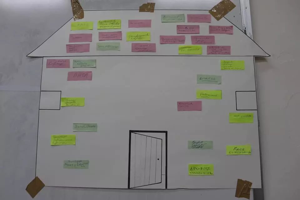 Varias iniciativas y dinámicas caracterizaron el intercambio, por ejemplo, la “construcción” de la casa propia con deseos, valores, anhelos… de los presentes, donde cada uno aportaba “un ladrillo”.