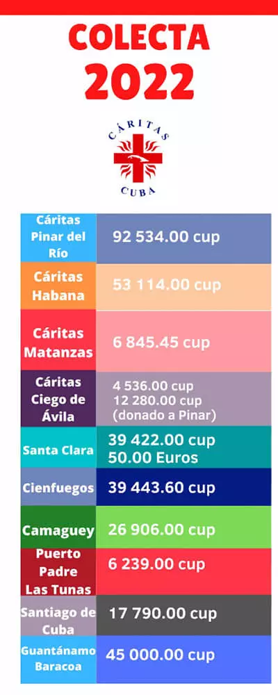 La Colecta Anual de Cáritas Cuba en 2022 recaudó 344 mil 110.05 pesos junto a otros aportes materiales dirigidos a servir a los más vulnerables, iniciativa en la que participaron fieles y personas de bien de todas las diócesis del país, a los cuales agradecemos inmensamente sus gestos caritativos.