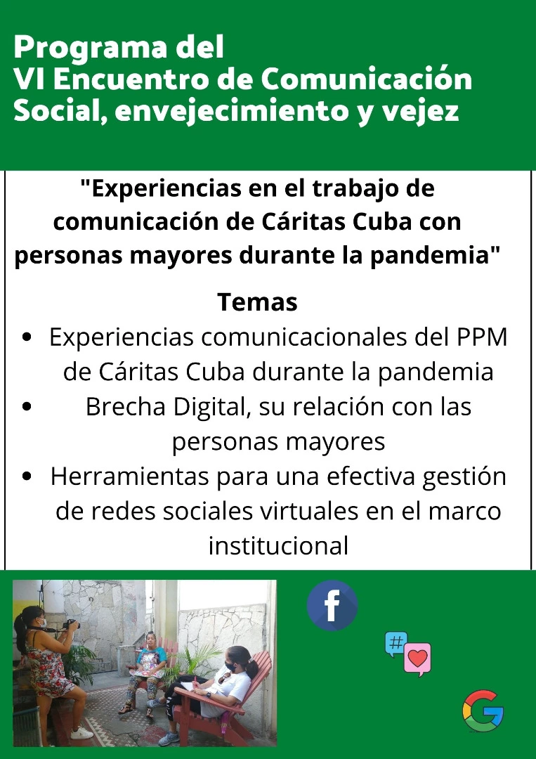 “Experiencias en el trabajo de comunicación de Cáritas Cuba con personas mayores durante la pandemia” es el tema propuesto para el evento formativo, el cual busca motivar y capacitar a los equipos diocesanos del Programa y a los comunicadores de la red de Cáritas en torno a la gestión de redes sociales virtuales, a la vez que sistematizar las experiencias comunicativas emergentes que han aflorado en medio del aislamiento social.