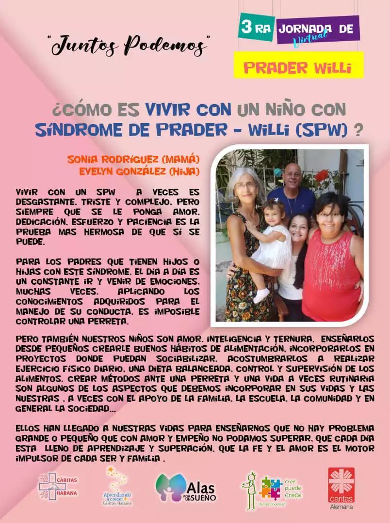 La Habana, 6 de junio de 2022— Desde el pasado lunes 31 de mayo y hasta el sábado 4 de junio, el programa Aprendiendo a crecer de Cáritas Habana celebró en sus redes sociales la Tercera Jornada Virtual de Prader-Willi; que con el lema “Juntos podemos” intentó acercar a sus usuarios al mundo de las personas que poseen este Síndrome, así como a las vivencias de sus familias.