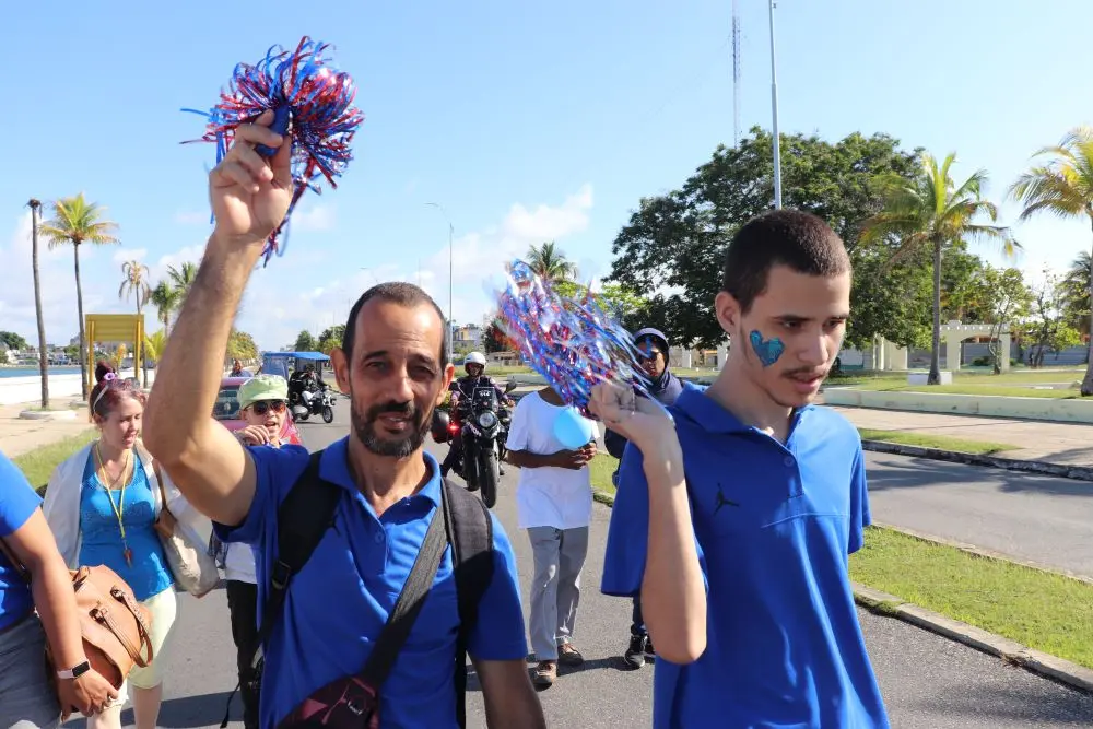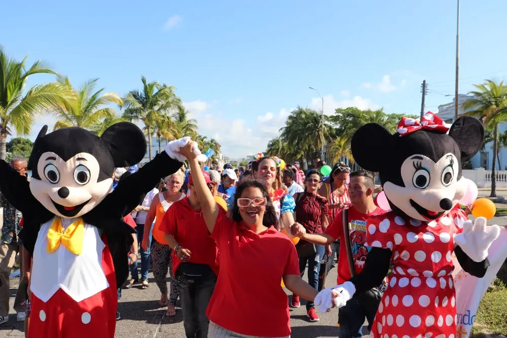 Globos, carteles y música llenaron de colorido y entusiasmo la caminata, a la cual se sumaron en esta ocasión dos personajes muy conocidos, Minnie y Mickey Mouse, del emprendimiento Marlén Decoraciones, quienes junto a la instructora de arte y animadora Nuria Vega Valdés, contribuyeron a llevar a puerto seguro el mensaje de la Jornada: visibilizar, sensibilizar y concientizar a la sociedad cubana sobre las realidades y derechos que atañen a las personas en situación de discapacidad física e intelectual.